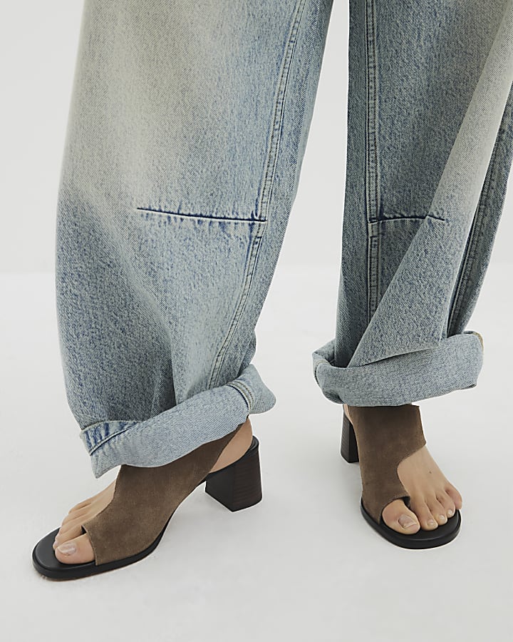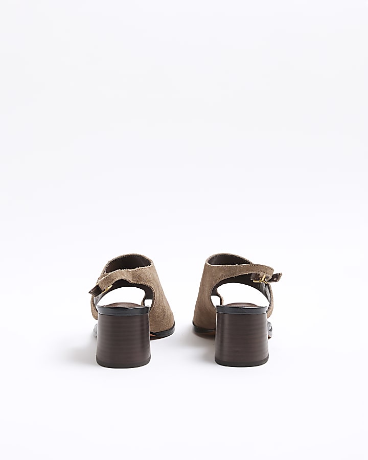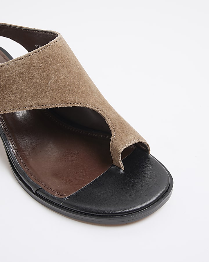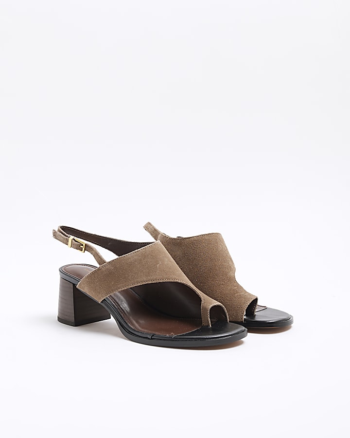 Brown Suede Toe Thong Block Heeled Sandals